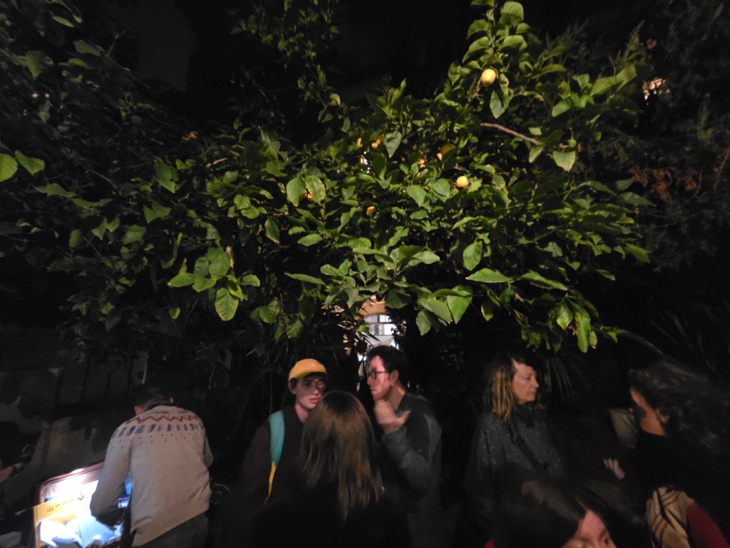 Et puis, on nous invite à poursuivre dans la cour de l’immeuble, véritable oasis de verdure au cœur de la ville, sous les grands citronniers. Là, nous avons installé un buffet partagé, et c’est mon compagnon Nicola qui s’est chargé de la cuisine. Il a fait cinq plaques de pizza et pissaladière et des dizaines de muffins. Un travail incroyable qui a permis de très agréablement poursuivre la soirée.
