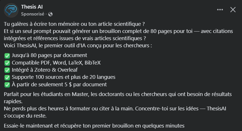 La publicité promet un résultat conforme aux exigences formelles d’une thèse de doctorat. L’application est donc censée faire en quelques secondes ce qu’un doctorant mettait trois ans à faire. Certes, le document final ne peut excéder 80 pages, mais il suffit de relancer la génération plusieurs fois, et le tour est joué. Évidemment, il y a des chances que, si le prompt est mauvais, le résultat soit pitoyable, mais les IA se sont tellement améliorées récemment que je ne doute pas qu’un prompt intelligent puisse produire un résultat bluffant.