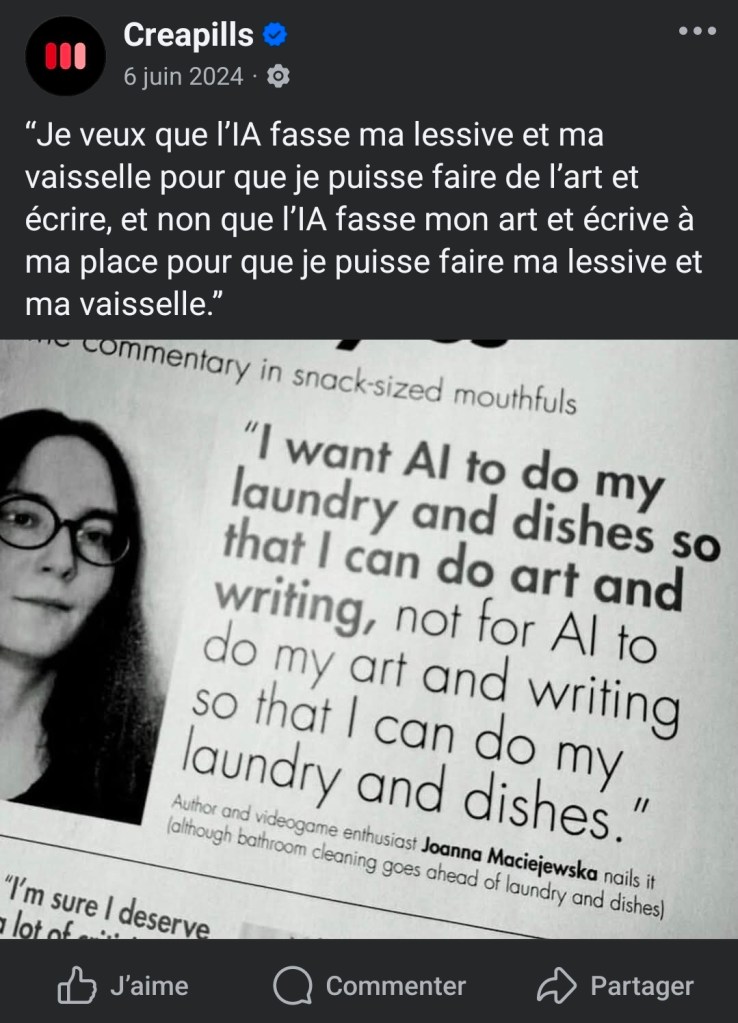 Je pense que l’IA peut avoir sa place comme assistance au traitement des données, facilitant les tâches rébarbatives pour permettre à l’humain de se concentrer sur le cœur de son travail : la créativité, l’imagination, la réflexion, la recherche…