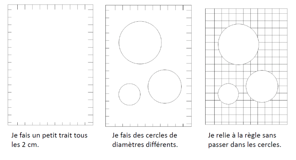 ♦ Réalisation 1 (CP) : Tracés libres à la règle, mais avec le contrainte que ça aille d’un bord de la page à un autre. Puis colorier les interstices. Si les élèves n’ont pas de triple décimètre, il vaut mieux utiliser du papier A5.