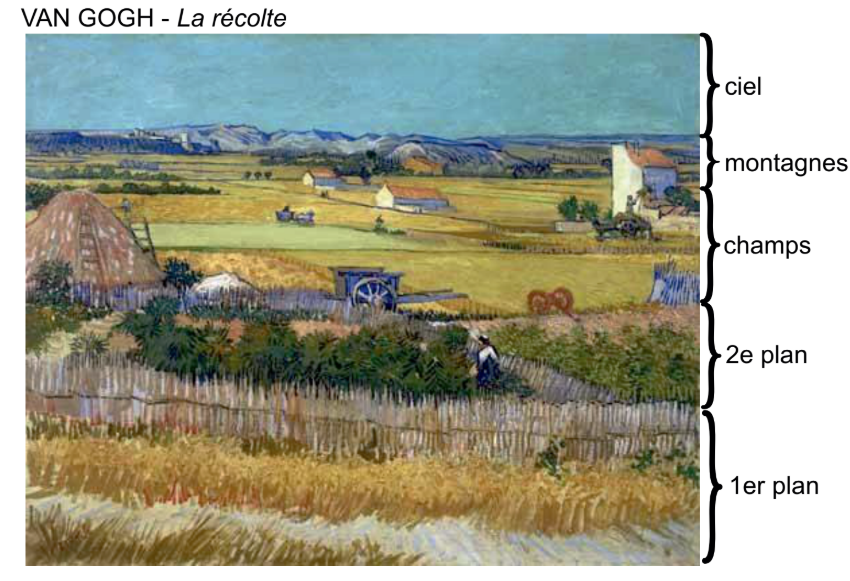 Un temps d’observation collective du tableau de Van Gogh doit permettre de faire émerger l’existence de plusieurs « plans », depuis le premier plan où les choses sont représentées en gros, et les arrière-plans où de gros objets (les maisons) prennent plus de place que les personnages du premier plan. Plus c’est loin, plus c’est petit.